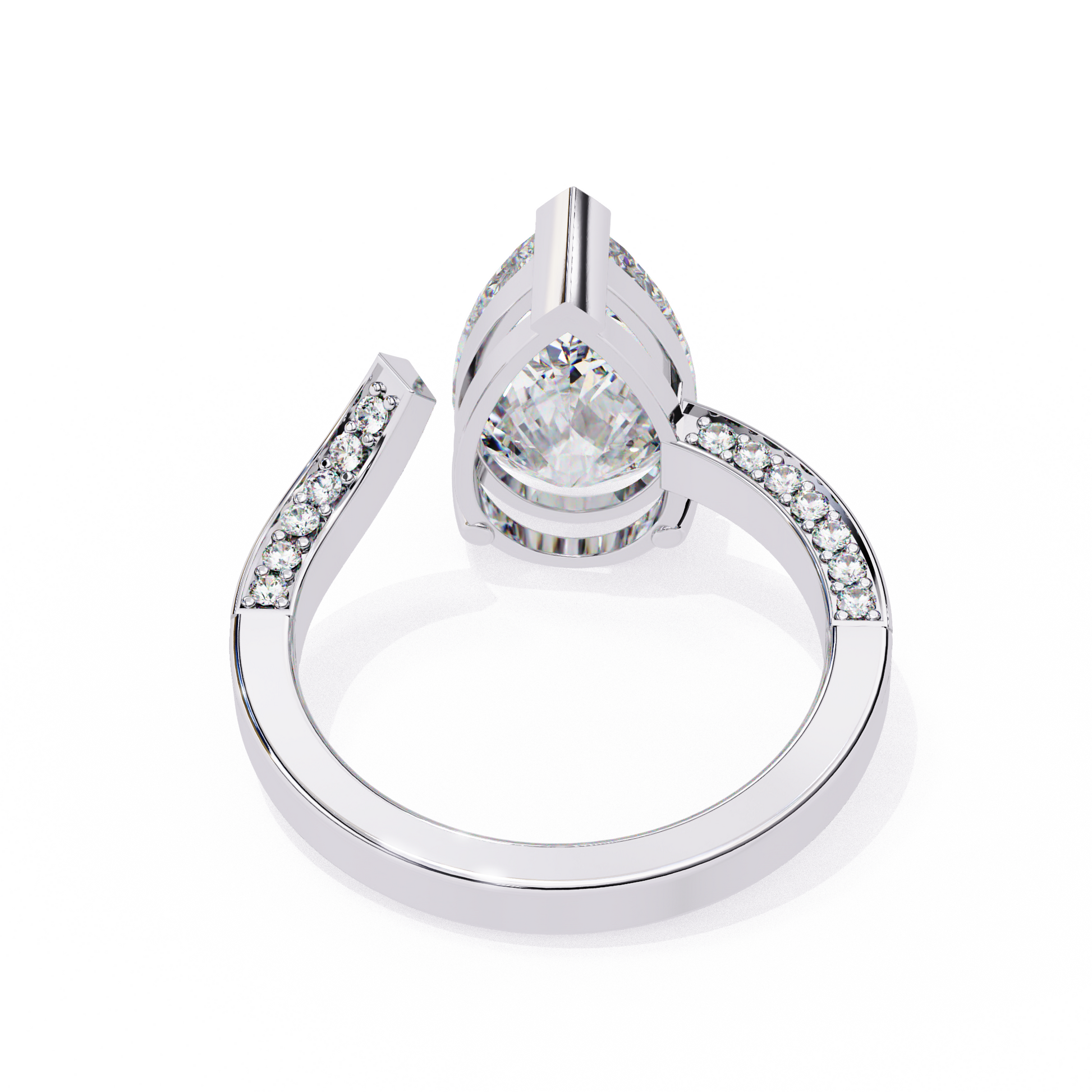 Contemporary open bypass ring featuring a prominent pear-shaped diamond set between diamond-paved white and yellow gold bands.