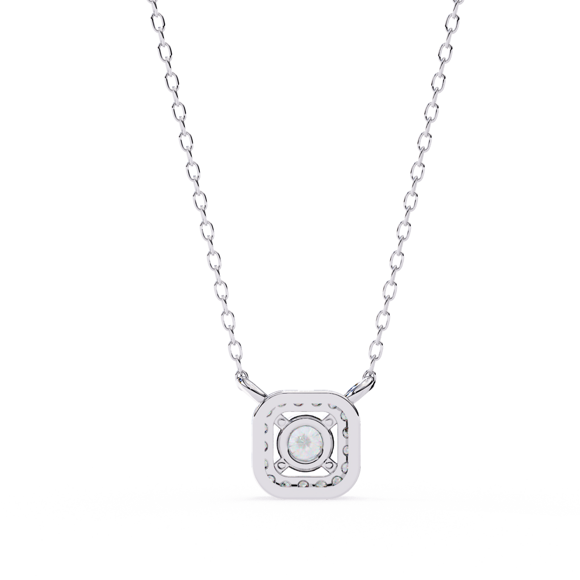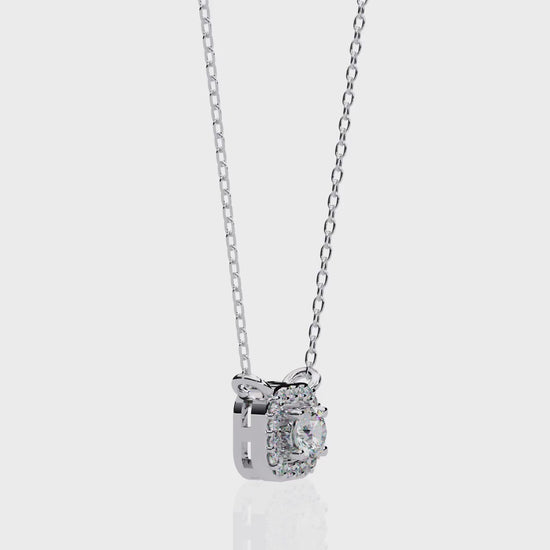 This classic pendant features a round shaped diamond encircled by a sparkling halo for an intense and fiery display of light.