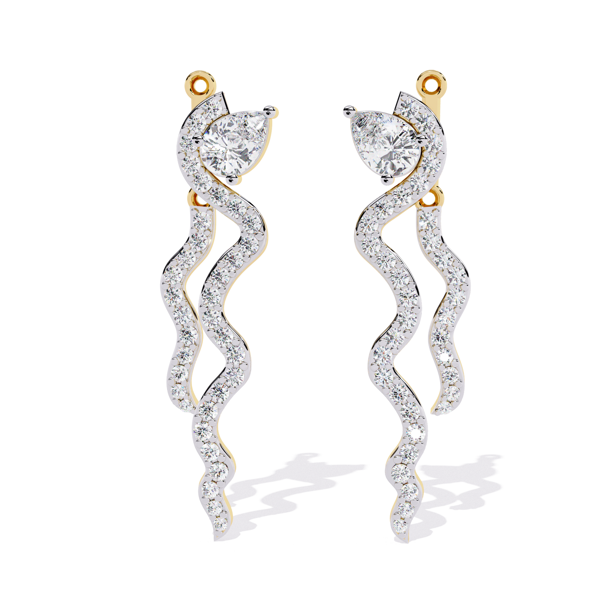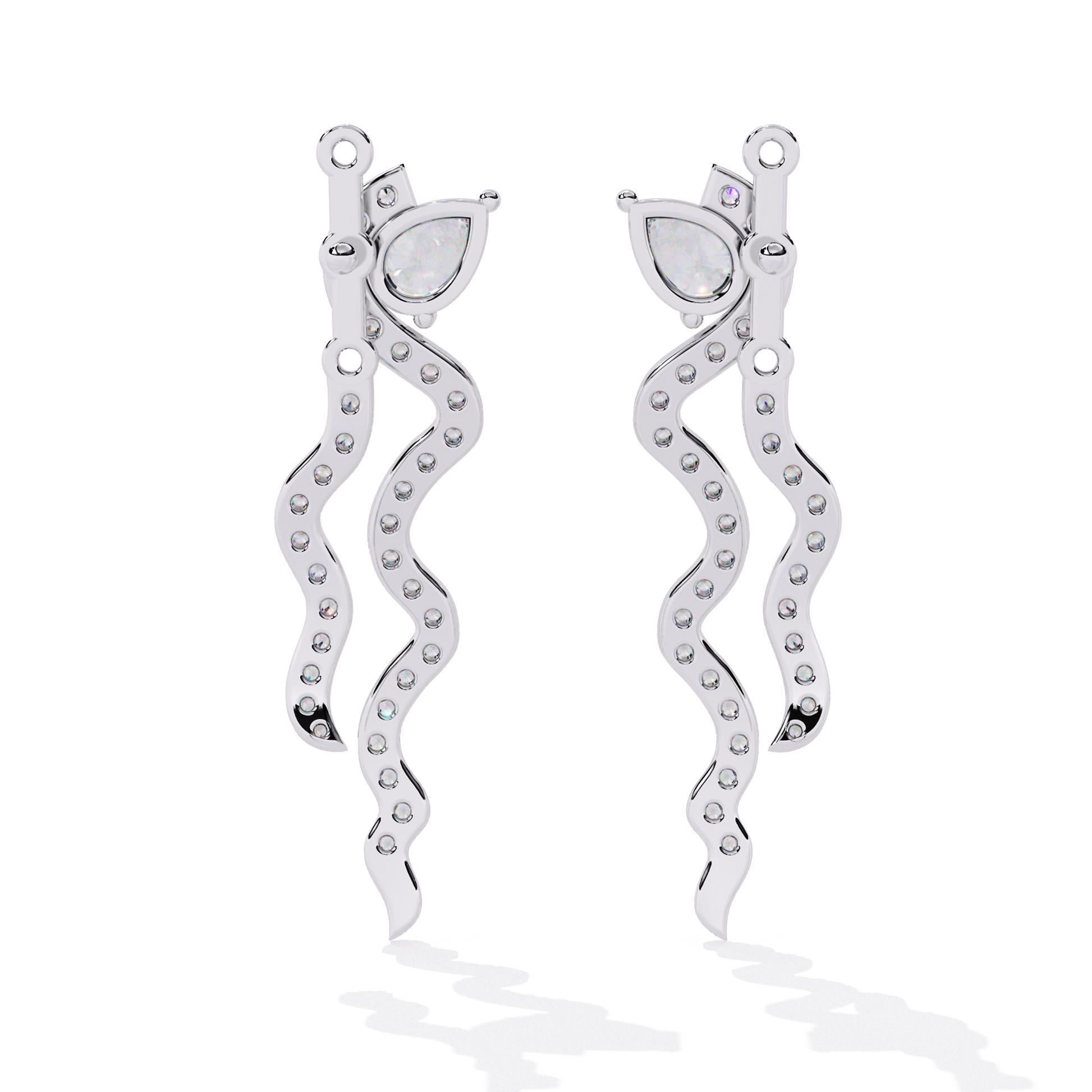 Elegant earrings featuring a pear-shaped diamond top, followed by a long, serpentine cascade of shimmering pavé-set diamonds.