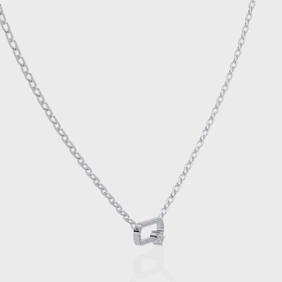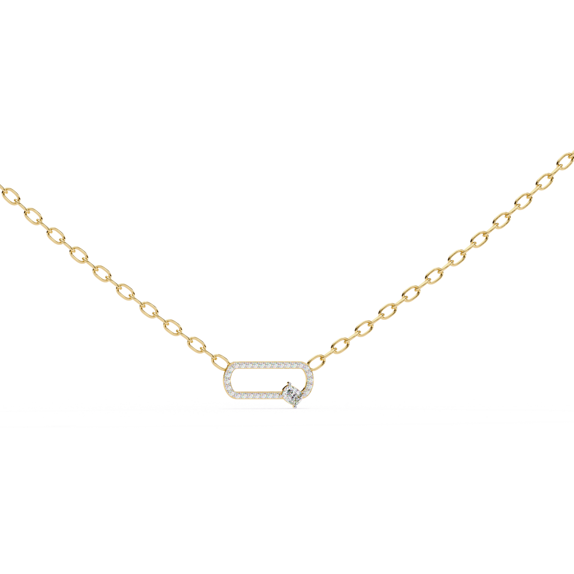 Modern yellow gold pendant featuring a pavé-set rectangular link with a single, floating oval-cut diamond inside.
