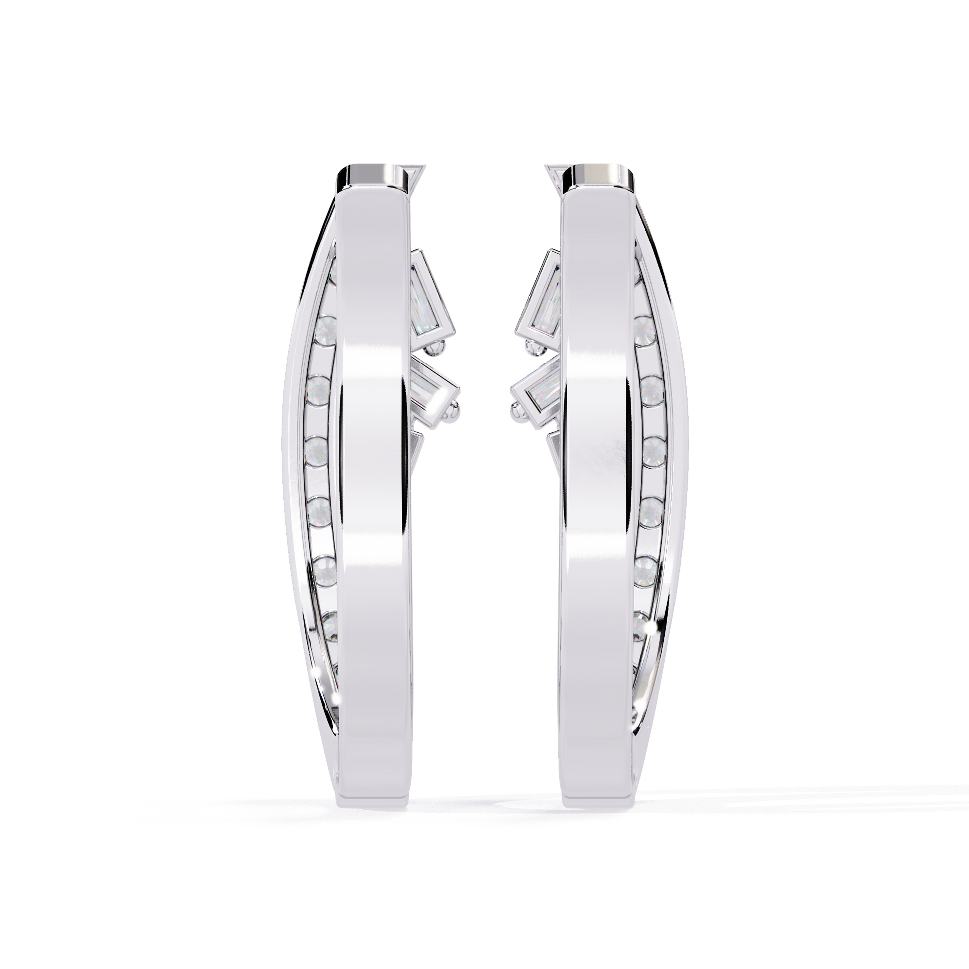 Contemporary two-tone J-hoop earrings featuring scattered baguette-cut diamonds framed by two parallel rows of round brilliant diamonds.