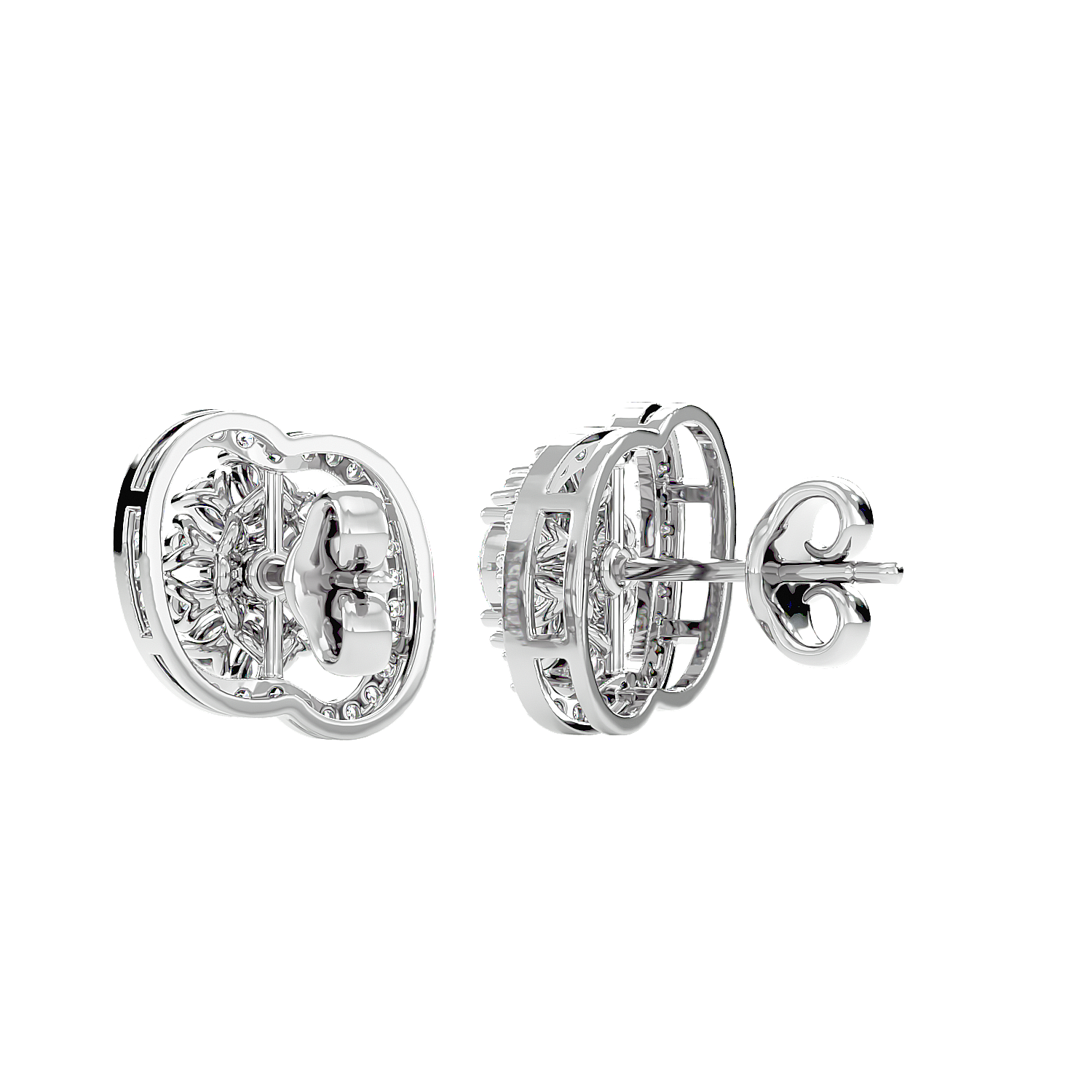 Elegant yellow gold stud earrings featuring a central diamond flower cluster framed by two graceful, interlocking oval rings fully encrusted with pavé diamonds.