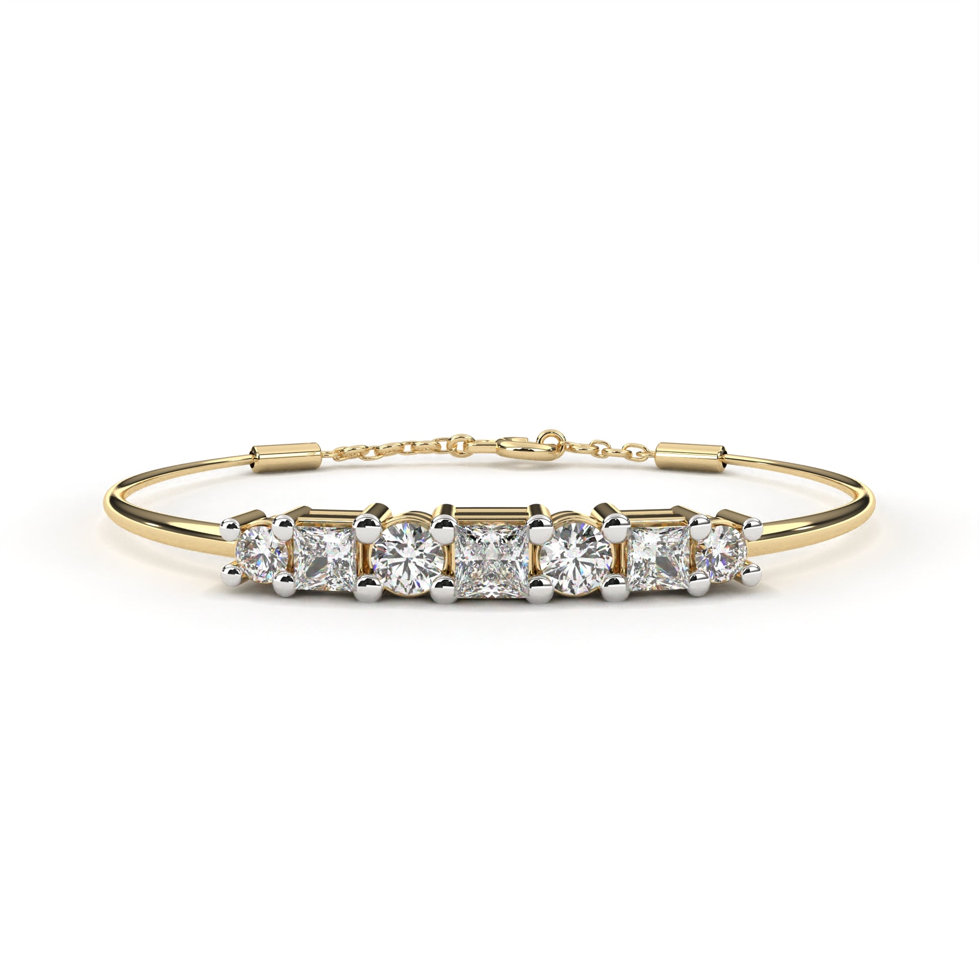 Stunning bar of seven, perfectly aligned princess-cut & round shaped diamonds brings architectural elegance to this minimalist and contemporary gold bracelet.