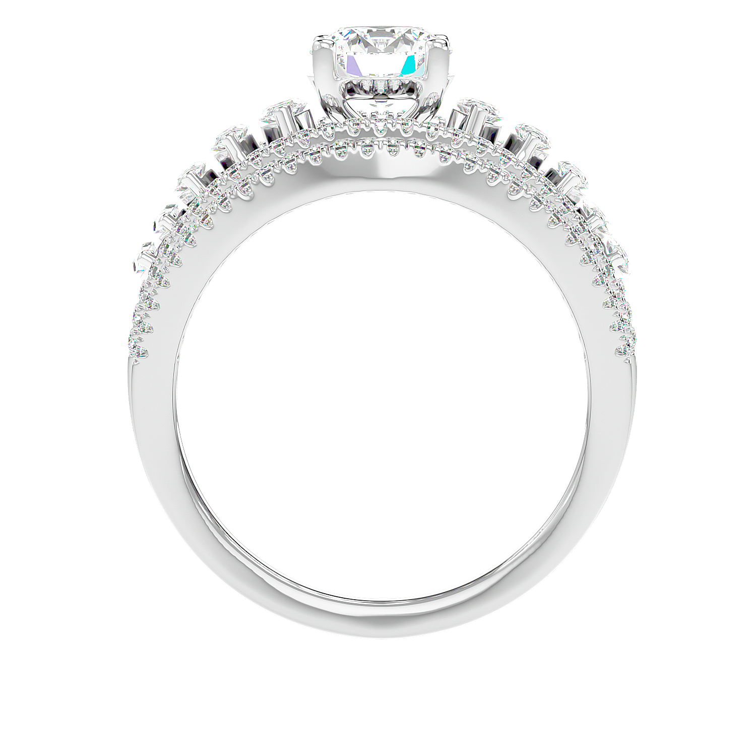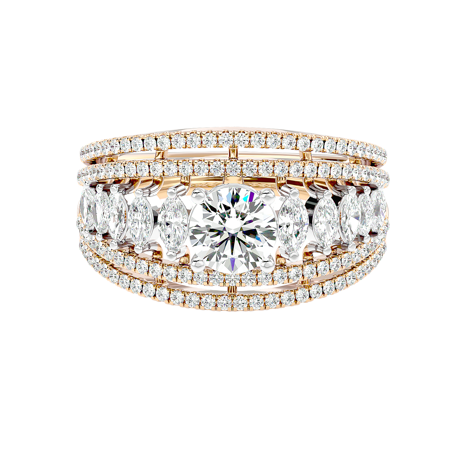 Majestic statement band of unparalleled grandeur, where a royal procession of large round and marquise diamonds is bordered by shimmering, multi-row arcs of light.