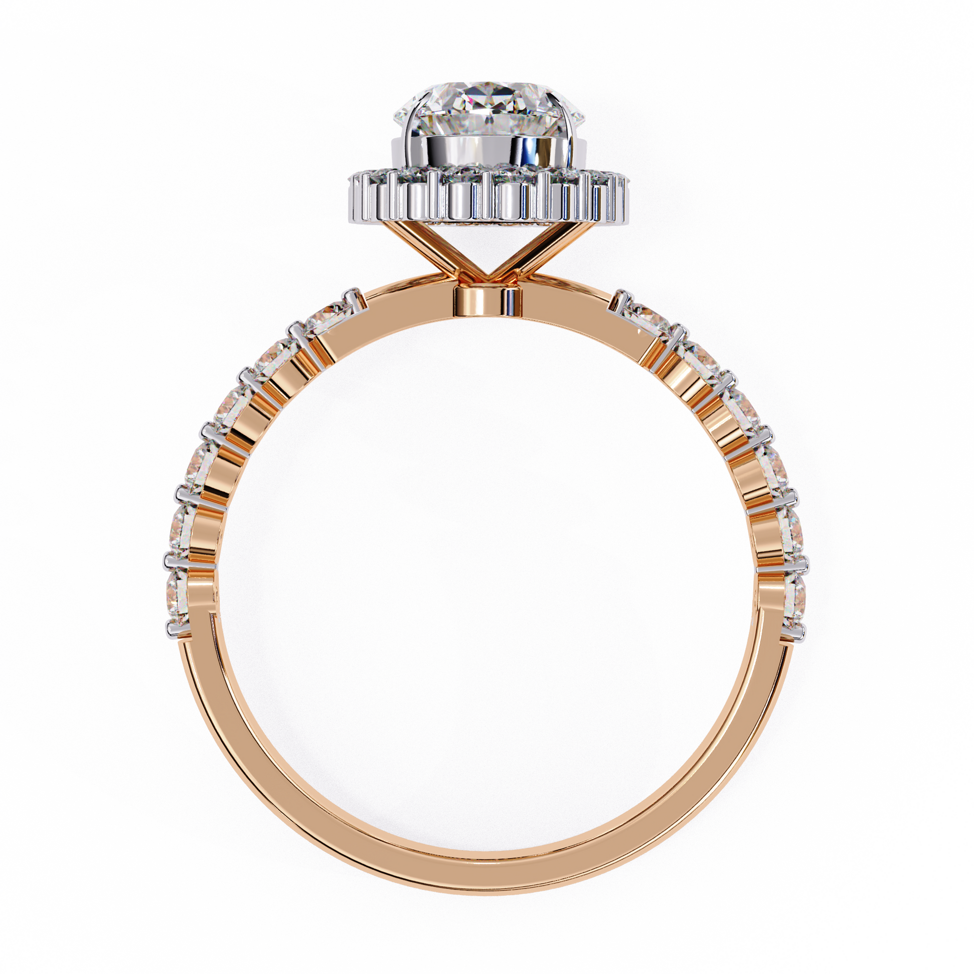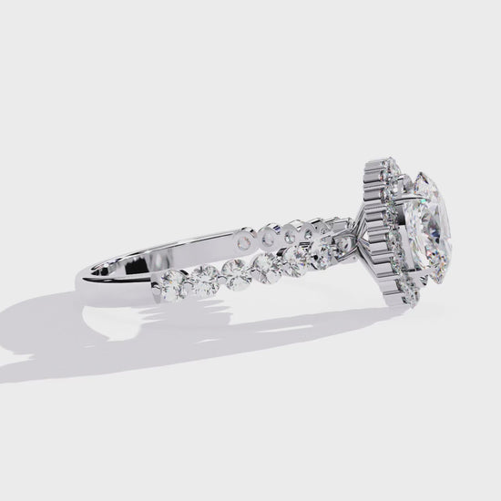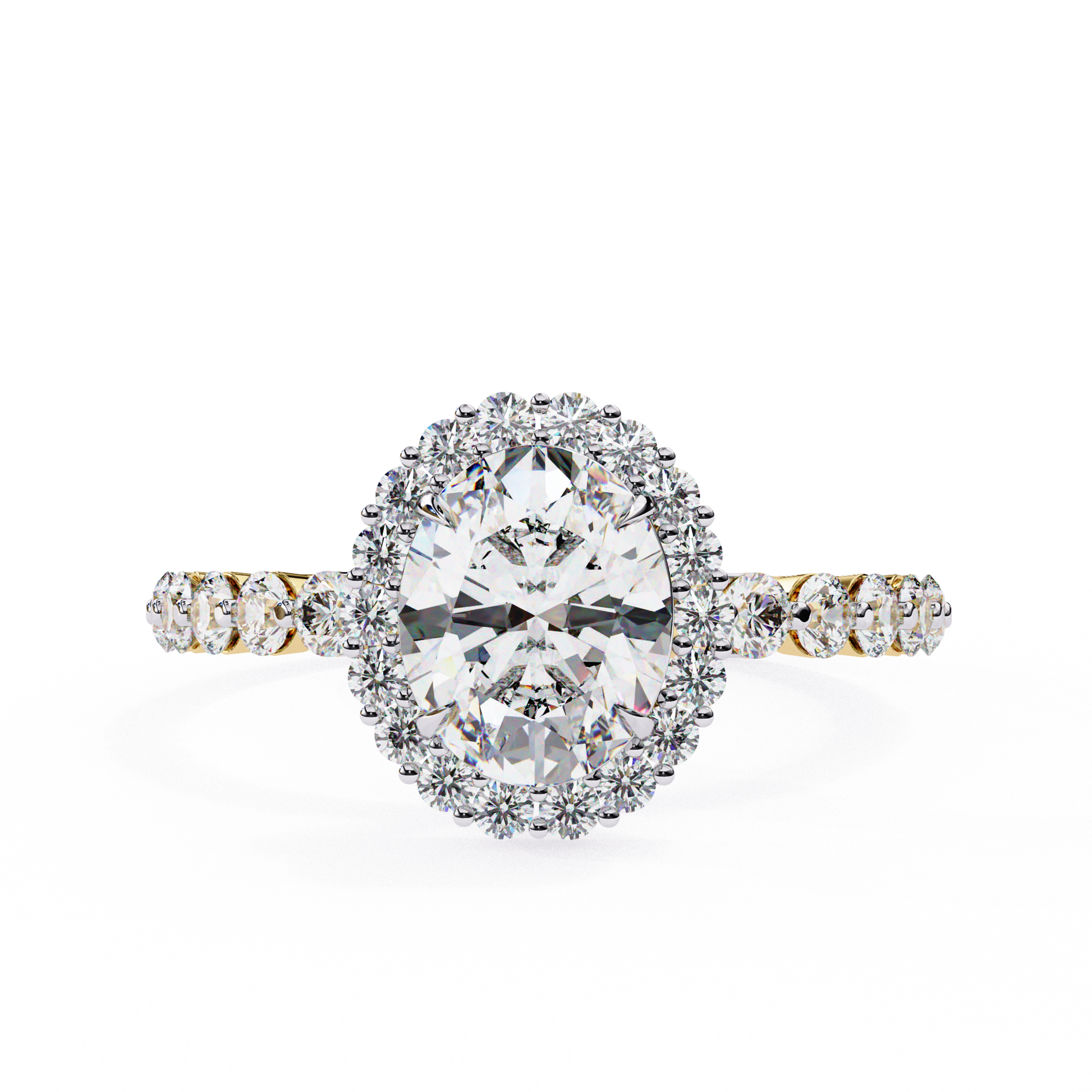 Stunning oval-cut diamond encircled by a brilliant halo and set on a sparkling yellow gold pave band.