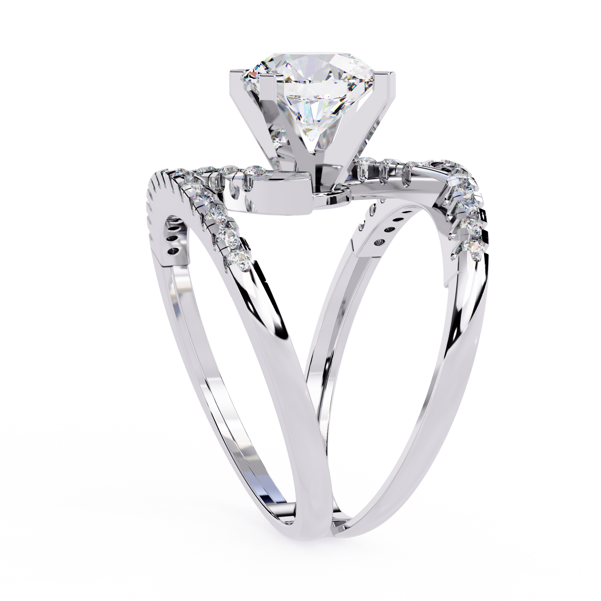 Two-tone ring featuring a round brilliant solitaire suspended between two parallel bands by a dynamic, "S"-shaped pavé diamond bridge.