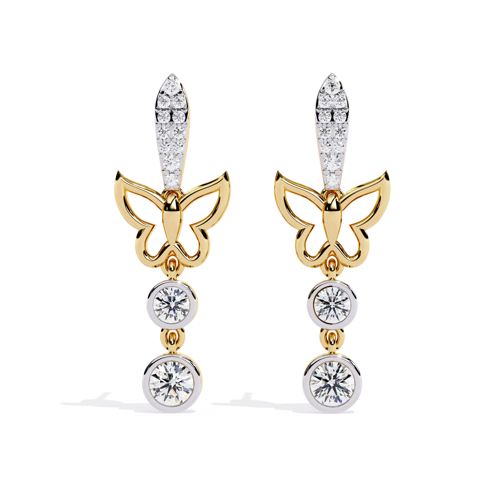 Charming two-tone dangle earrings featuring a pavé diamond stem, a gold butterfly, and two bezel-set diamond drops.