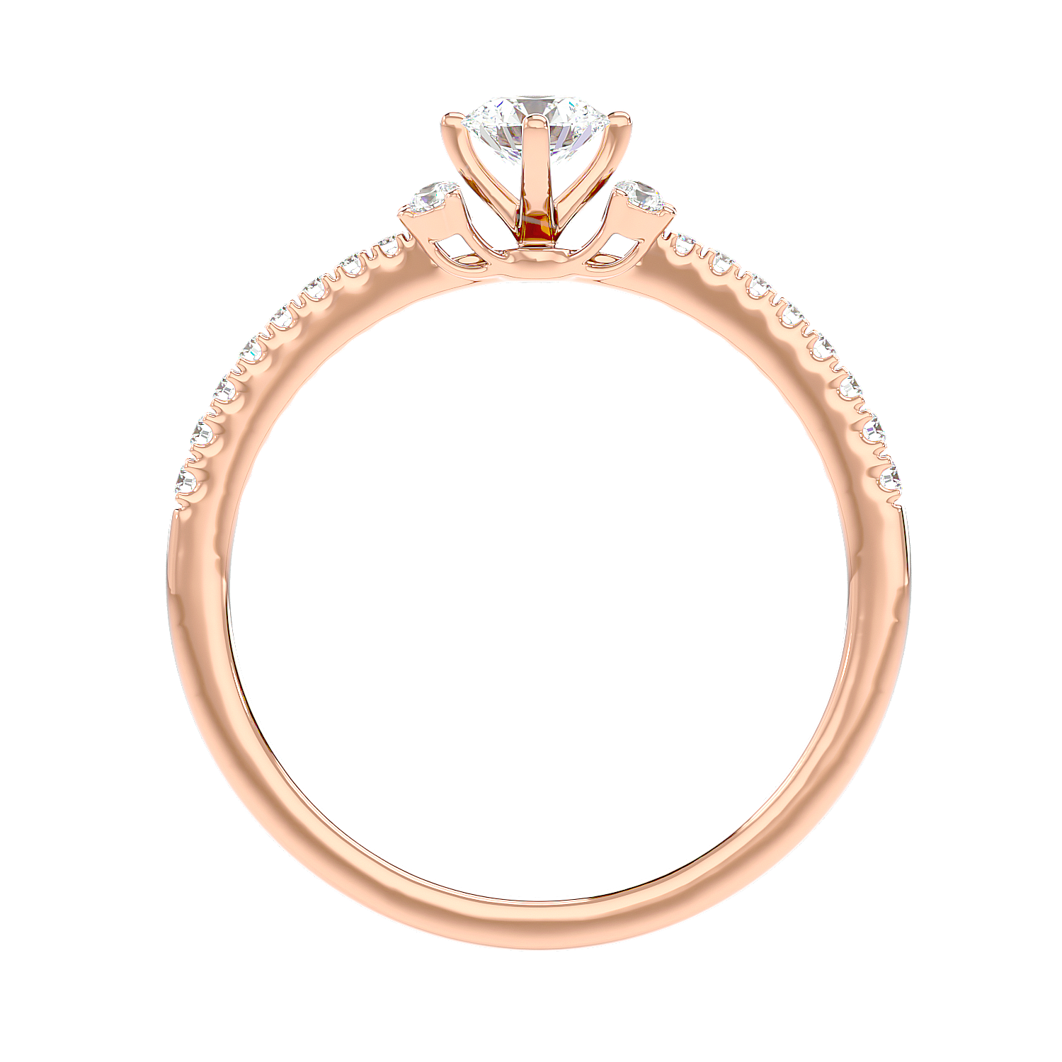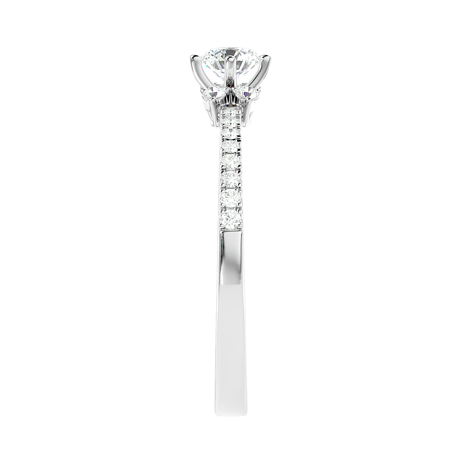 Delicate ring featuring a six-prong round center diamond, flanked by small diamond clusters, on a slender pavé band.